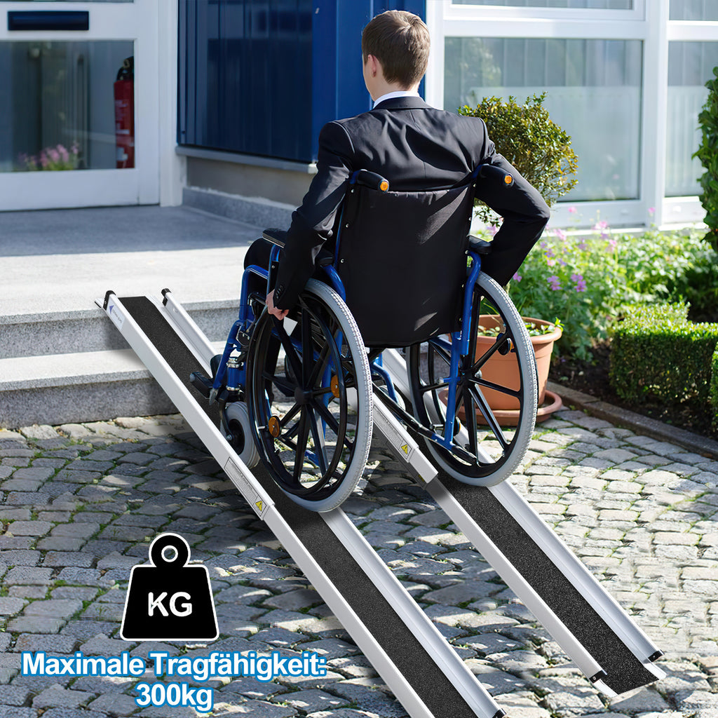 Hochwertiges Material: Rollstuhlrampe ist aus hochwertigem und haltbarem Aluminium gefertigt, kann bis zu 300 kg tragen, sehr stark und haltbar, und das Aluminiummaterial ist leicht elastisch, rollstuhlrampe kann sich beim Umgang mit schweren Gegenständen leicht verbiegen, keine Sorge, es wird automatisch zurückfedern.