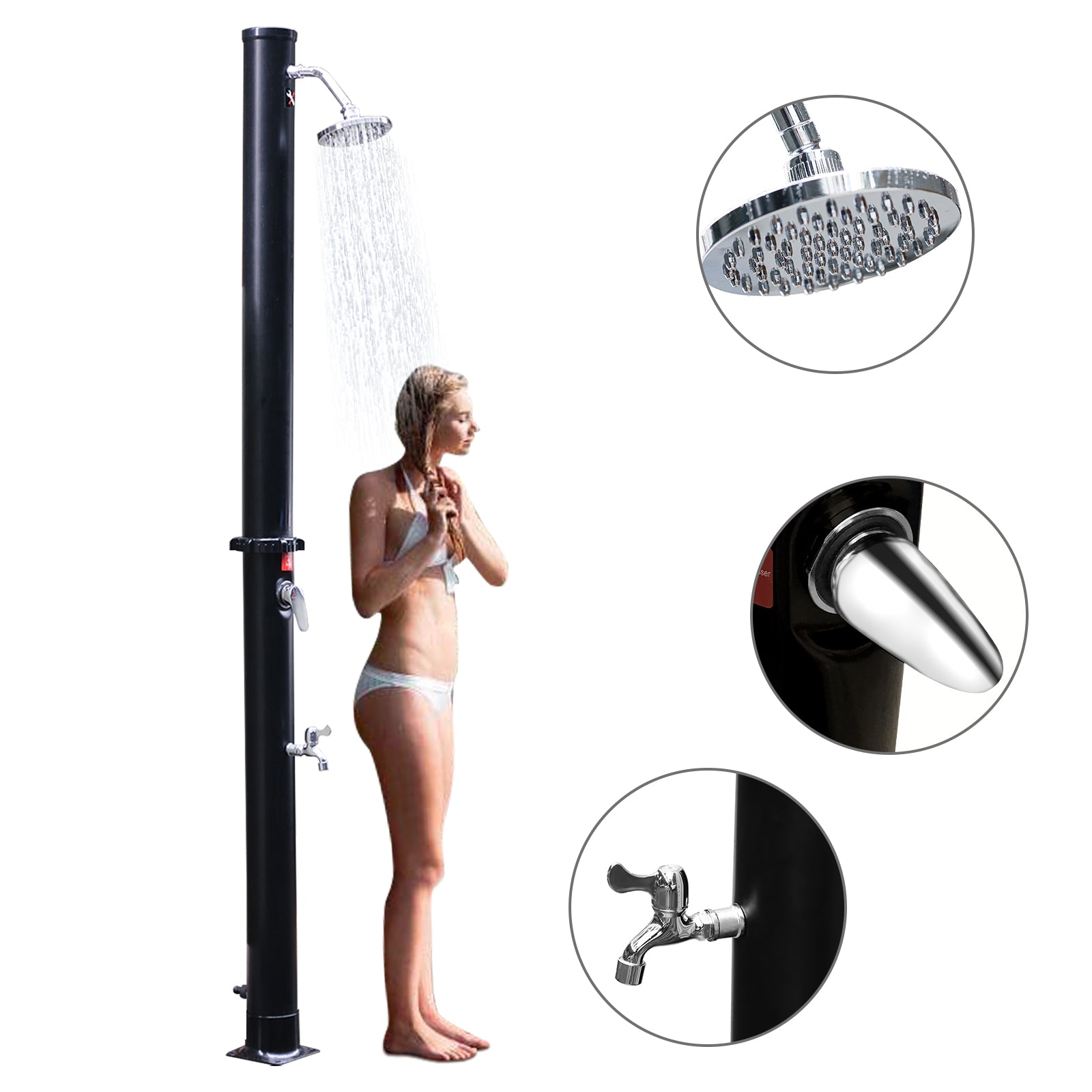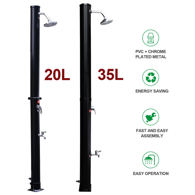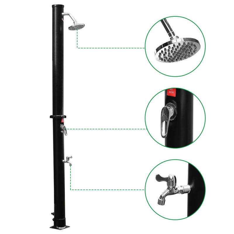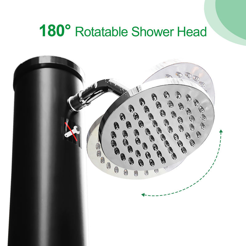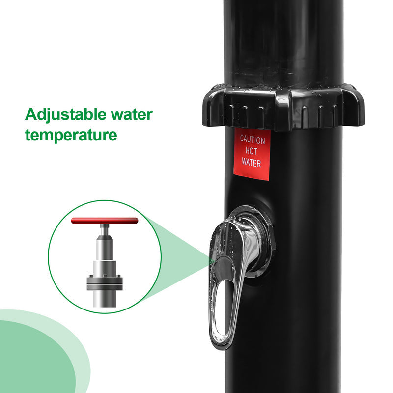 Die verchromte Solardusche ist aus hochwertig PVC+ABS. Die Dusche ist UV-beständig und korrosionsbeständig. Sie lässt sich mit Gartenschlauch anschließen. Wassertank der Dusche wird mit Hilfe des Schlauches befüllt. Wasser erwärmt sich durch die Sonneneinstrahlung binnen 3-4 Stunden auf bis zu 60°C. Über eine Einhebelmischbatterie vermischt sich das warme Wasser im Tank mit dem kalten Wasser aus dem Gartenschlauch. Somit lässt sich die Wassertemperatur stufenlos nach Bedarf einstellen. Die Dusche ist geeignet für Pool, Garten, Camping, Außendusche usw.