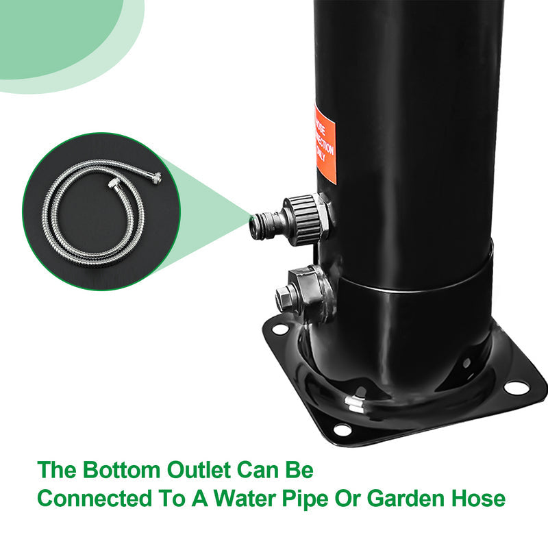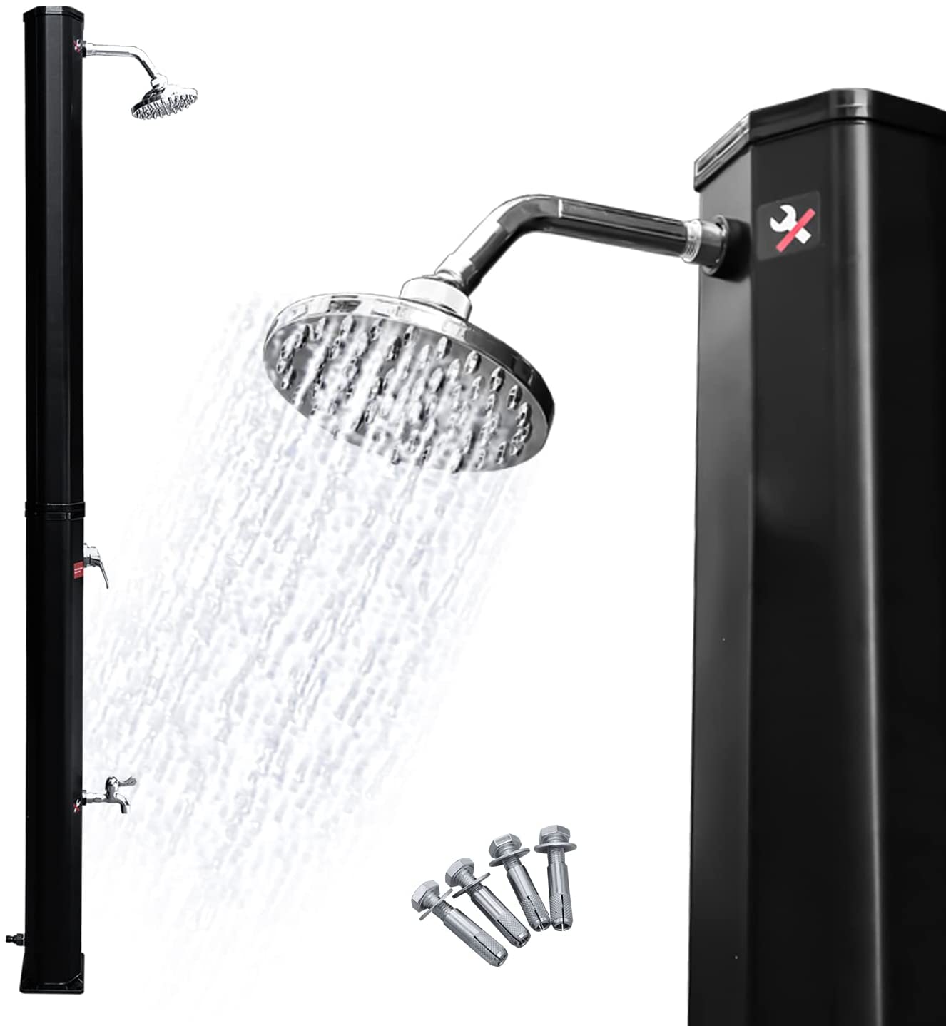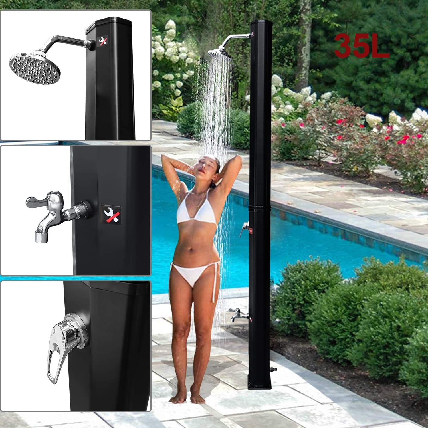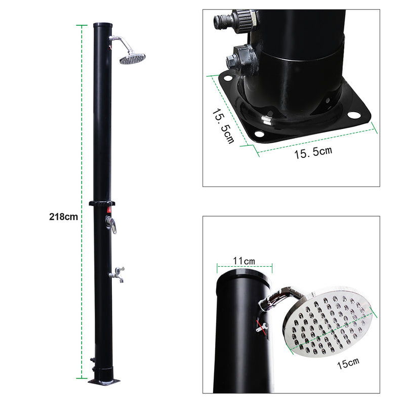 Die verchromte Solardusche ist aus hochwertig PVC+ABS. Die Dusche ist UV-beständig und korrosionsbeständig. Sie lässt sich mit Gartenschlauch anschließen. Wassertank der Dusche wird mit Hilfe des Schlauches befüllt. Wasser erwärmt sich durch die Sonneneinstrahlung binnen 3-4 Stunden auf bis zu 60°C. Über eine Einhebelmischbatterie vermischt sich das warme Wasser im Tank mit dem kalten Wasser aus dem Gartenschlauch. Somit lässt sich die Wassertemperatur stufenlos nach Bedarf einstellen. Die Dusche ist geeignet für Pool, Garten, Camping, Außendusche usw.