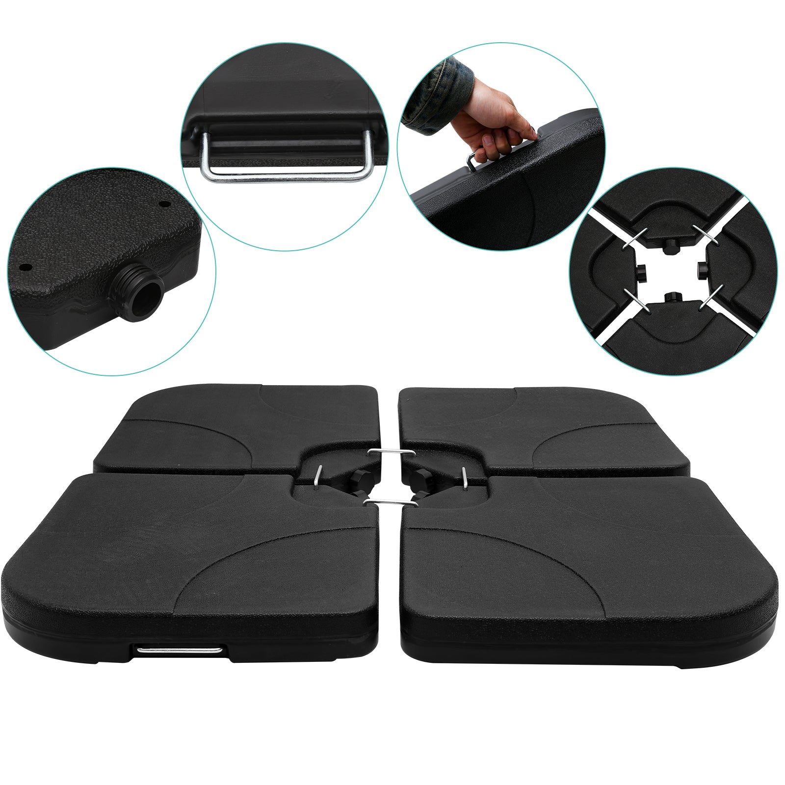 Die robuste 4-Quadrat-Grundstruktur wiegt 220 Pfund, wenn sie mit Sand gefüllt ist. Füllen Sie 4 Basen mit Sand. Legen Sie sie dann um die Schirmstange und legen Sie sie auf die schirmförmige Querstange.