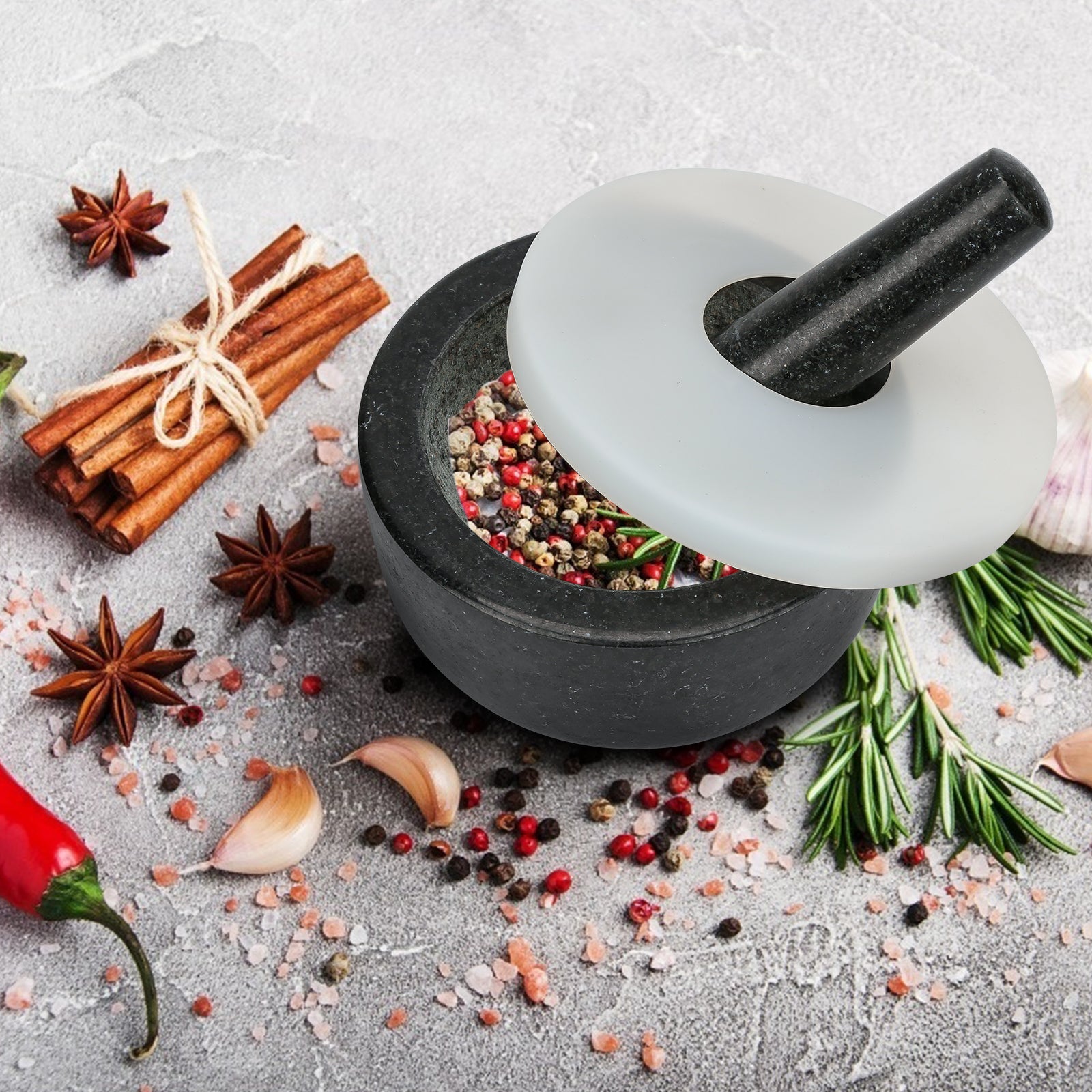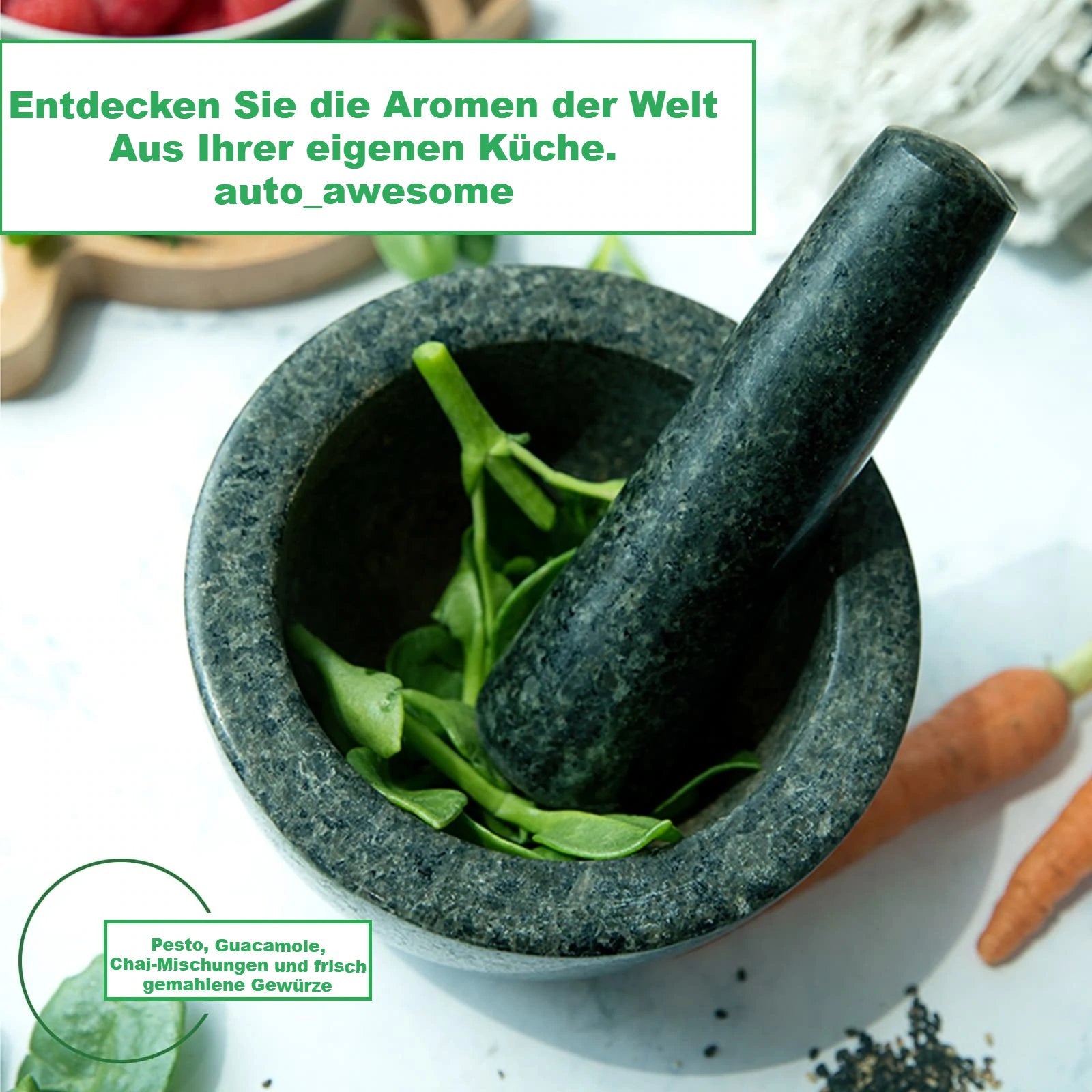 Er ist aus echtem Naturgranit gefertigt, liegt gut in der Hand und eignet sich hervorragend zum Zerkleinern von Gewürzen, Nüssen, Kräutern usw. zu einem sehr feinen Pulver oder einer Paste. Es ist robust und hat eine glatte Oberfläche, die für die gewünschte Textur sorgt. Einfach mit dem Stößel und dem Mörser festen Druck ausüben und schon ist die Arbeit getan. Ein Muss für den Haushalt!!!