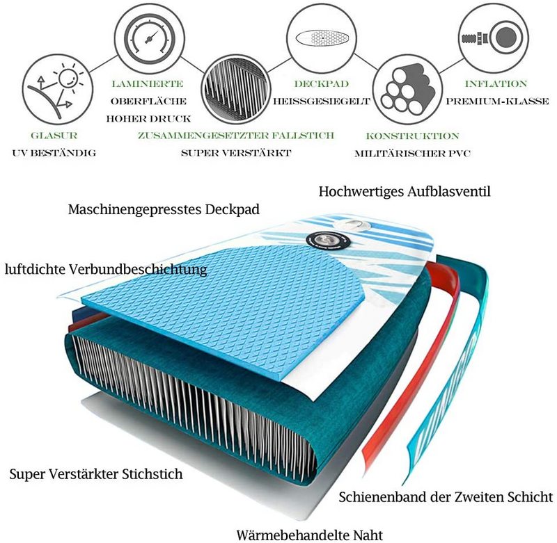 Schnell aufgeblasen und tragbar - tragen Sie Ihr Surfbrett mit! Es kann schnell aufgeblasen oder entlüftet werden, einfach zu verstauen. Ideal für Seen, Flüsse oder Ozeane. Aufblasen<3 Minuten, Ablassen <3 Minuten, maximaler PSI: 15